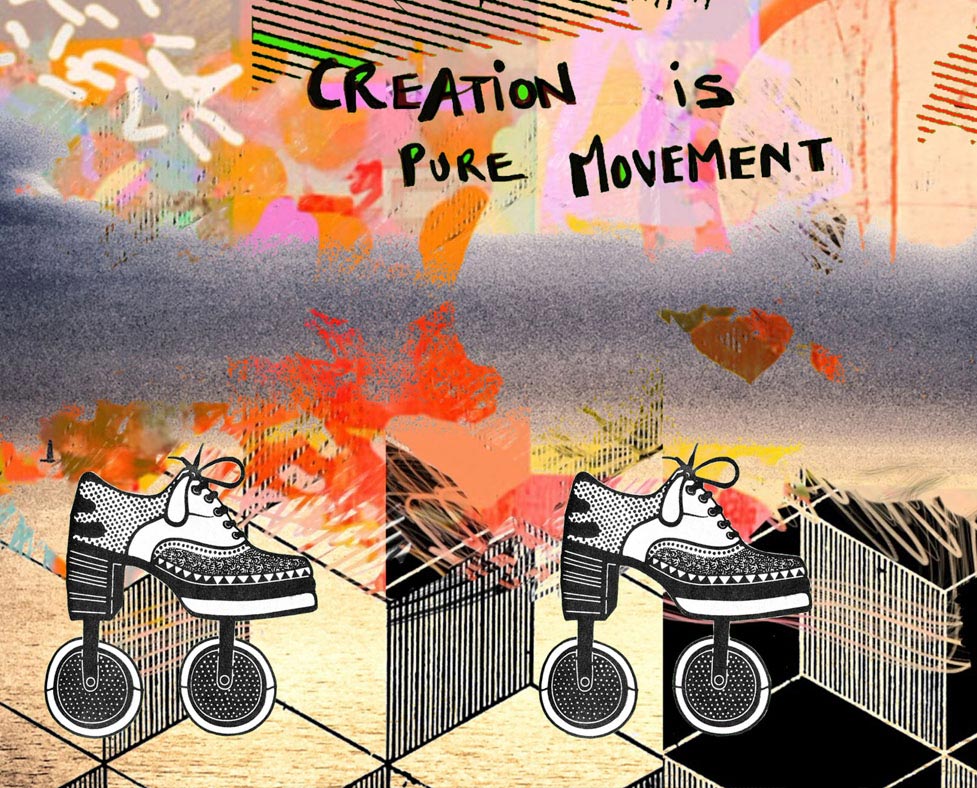 Working as a Gestalt art therapist, a creative coach and an expressive art teacher, led me to unwrap the fundamentals of my own creative process, particularly the play of chaos and order, the use of accident and intentionality. I became more and more interested in the bridging of both digital and hands-on analogue practices, looking for ways to stay energetically embodied, physically present and creatively playful while tapping into high speed data streams. While digital creation plugs into rapid data flow, an accelerated perception of time and a multiplicity of instant possibilities, hand made creation brings me back to what I call “earth & body time”, back to the sensoriality of artistic gestures like painting, cutting, assembling real materials and experiencing intimacy with the physicality of the medium itself.