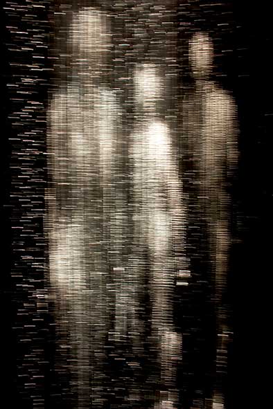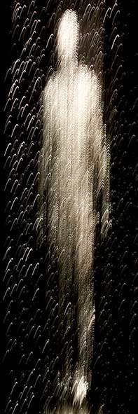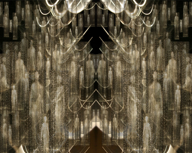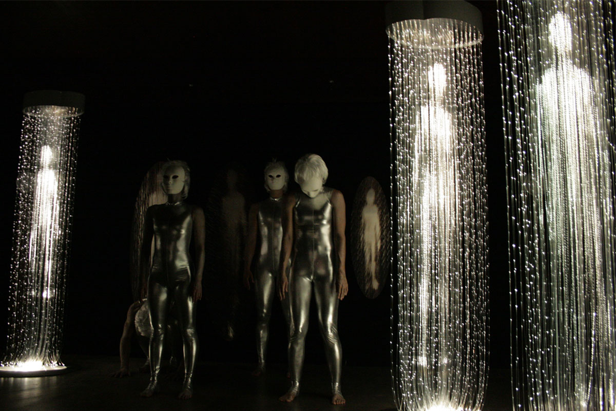 The exploration of “Presence and Absence” “Time and Evolution” emerged as essential threads while working with the medium of light. In 2003 I started using optic fibre, a light transmitting fibre mainly used for data transmission, and develop my own technic to sculpt light. In 2007 I created a family of ethereal light being: the “homos luminosos” (latin for man of light) made of constellations of light points carved in a mass of optic fibres. The “homos luminosos” stand at the threshold of time in a subtle disembodied “reality” made of pure light or information.