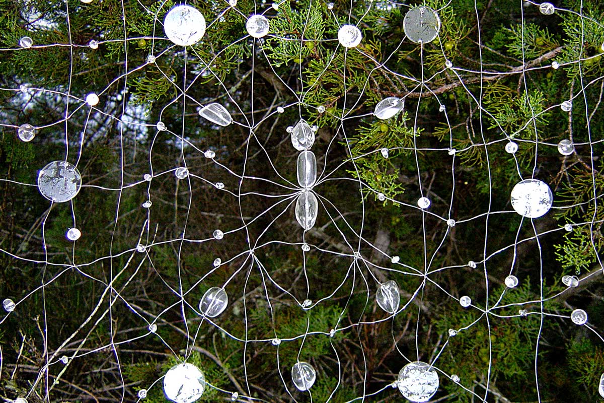 Fascinated by the concept of the web of life and the net of the god Indra, a metaphor used to illustrate the interdependence and interpenetration of life in Buddhist philosophy, I created series of netted like objects combining crystals, gemstones and light.